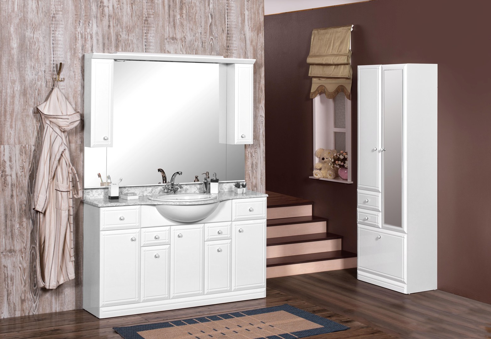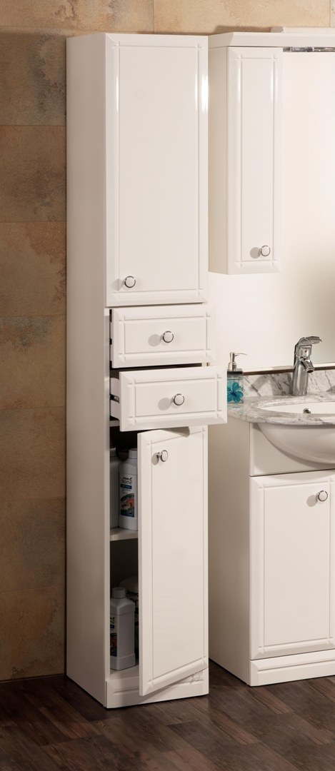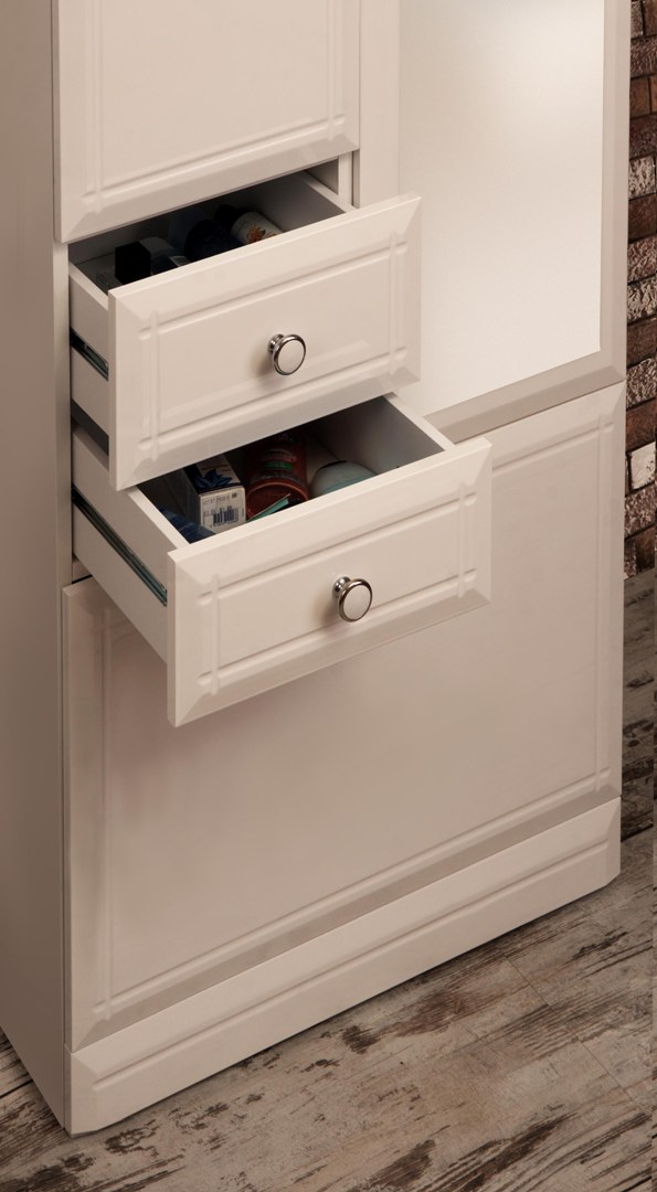 У данной коллекции имеется множество шкафчиков и ящичков, что позволяет расположить средства для гигиены, без которых невозможно обойтись ни одному человеку в ванной комнате.