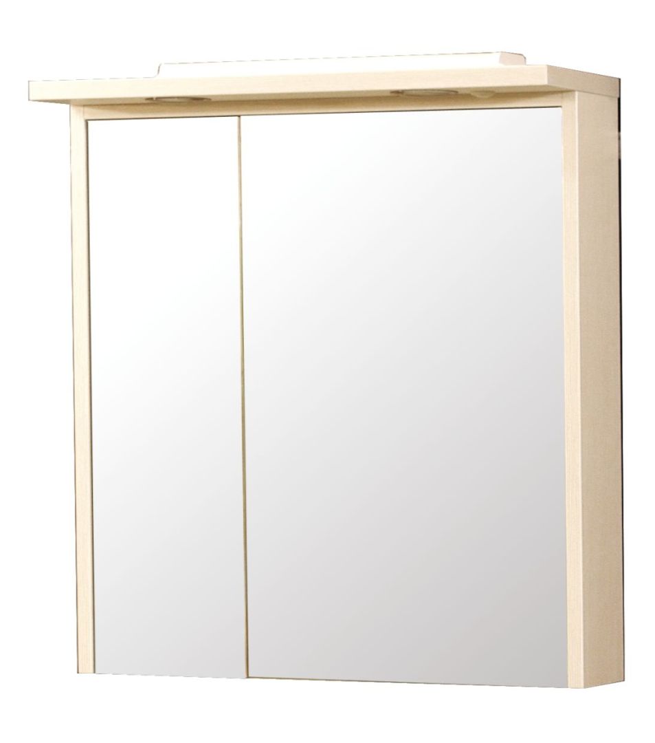 Зеркальные шкафчики комлектуются светильниками 220 V (по 2 шт. на зеркальные шкафчики 60 см и 70 см, 3 шт. - на модели 80 см), стеклянными полочками из закаленного стекла.